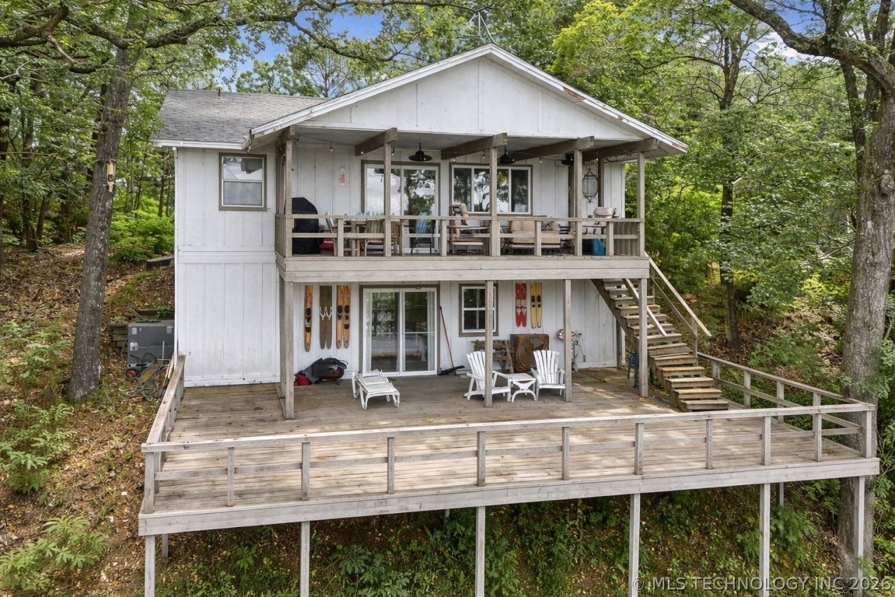 Enjoy an outstanding view of the main lake from this charming two-story cabin nestled along the shore of south Grand Lake.. The main level features a kitchen, a cozy living room, dining room and 2 bedrooms as well as a spacious deck perfect for relaxing or entertaining. The lower level includes a large bedroom with a full bath , offering ample space for guests or family. This property includes a one-quarter interest in a 1-acre parcel that provides access to a private shared boat dock-ideal for swimming, fishing, kayaking, and paddle boarding in the calm, protected waters of the cove. Located in a semi-private setting, the cabin offers a tranquil retreat while remaining close to popular attractions, marinas, boat launches, and dining. Fresh Paint and waterproof luxury vinyl flooring added. easily accessible by water. This is a unique opportunity to enjoy the best of lakefront living with added land for privacy and protection.